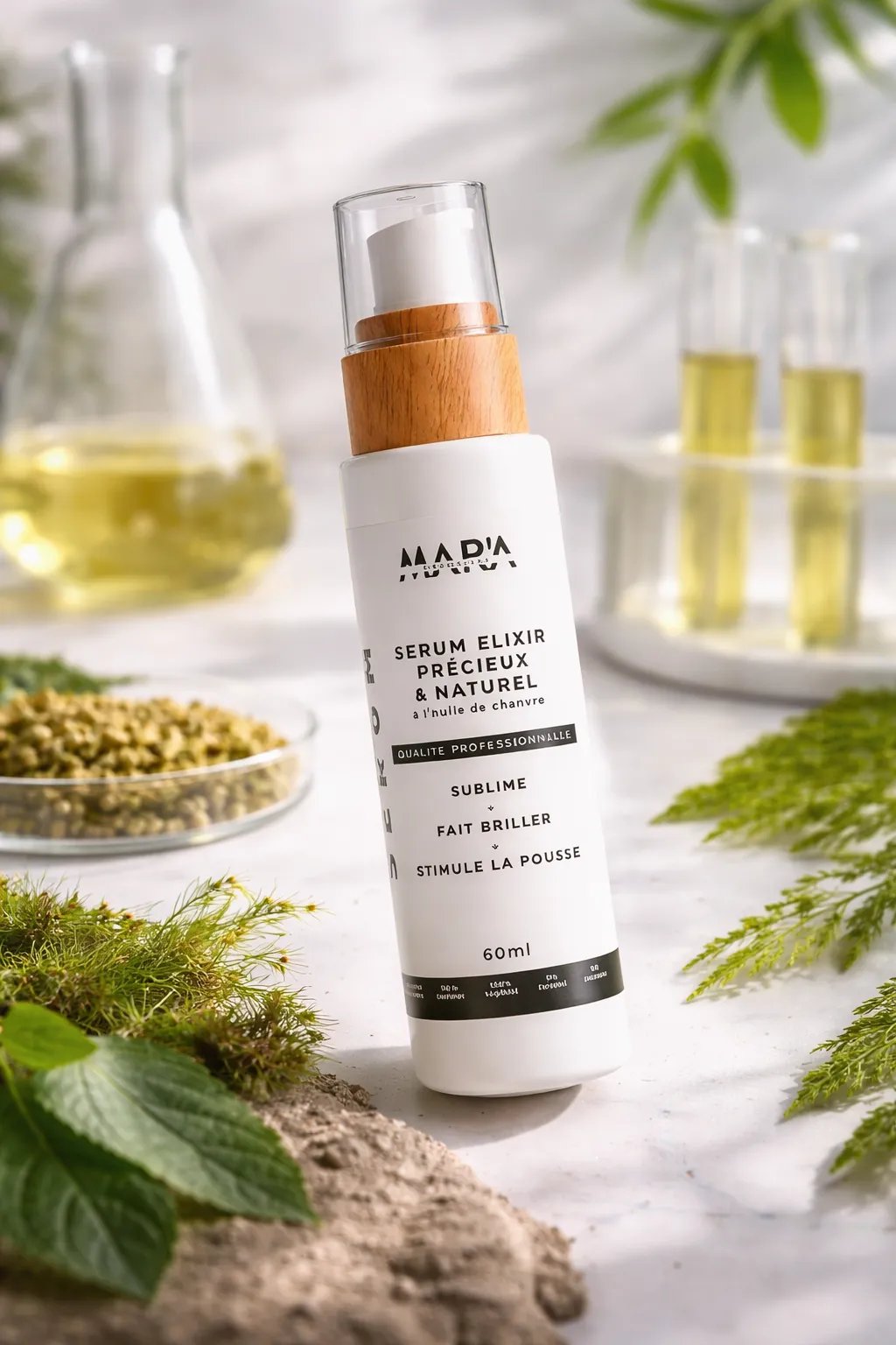 Huile de chanvre premium, kératine végétale, ingrédients d'origine naturelle soigneusement sélectionnés pour leur efficacité reconnue.